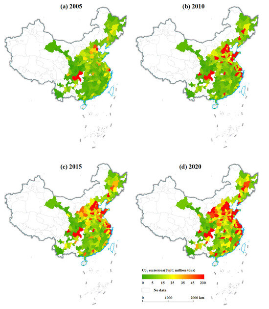 City-scale CO2 emissions data from 2005– to 2020 were acquired from the China City Greenhouse Gas Working Group (CCG) [45]. The data were collected and verified by first-hand on-site data using a bottom-up method, resulting in high accuracy. CO2 emissions were derived from China’s high-resolution geographic emissions grid data.
