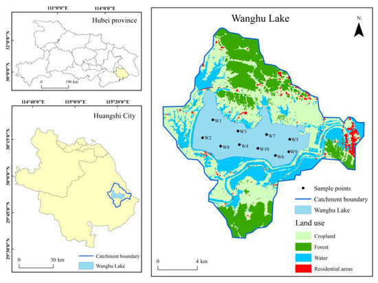 - Zhao, X.L.; Duan, L.; Zhou, J.L.; Liu, X.W.; Lu, W.Z.; Qiu, J.R.; Ke, H.; Zheng, H.S. Distribution characteristics, source analysis and risk assessment of heavy metals in Wanghu Lake of Hubei Province. J. Environ. Eng. Technol. 2023, 13, 1021–1030. (In Chinese) [Google Scholar]