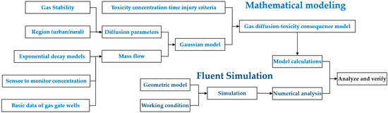 Regarding the study of gas leakage diffusion, computational fluid dynamics (CFDs) numerical simulation has been widely employed by scholars both domestically and internationally to simulate and analyze buried pipelines and underground pipeline corridors [18,19]. However, there have been fewer studies conducted on the leakage of valves inside gas gate wells. Numerical simulation often demands extensive time and computational resources. Moreover, iterative calculations prove to be inefficient. Additionally, the numerical simulation of gas leakage typically relies on artificially defined parameters such as leakage aperture and velocity, which fail to accurately represent real-life gas leakage scenarios. To address these issues, this paper proposes a gas gate well leakage diffusion model that is based on on-site monitoring data of gas concentration. This model predicts the variation pattern of gas concentration within the gate well and assesses the potential distance at which gas leakage outside the gate well can pose a hazard in the atmosphere. By swiftly determining the future well’s gas concentration trend and potential accident consequences through monitoring the leakage concentration, this research holds significant implications for the early warning and emergency response of gas leakage accidents. The study route is shown in Figure 1.
