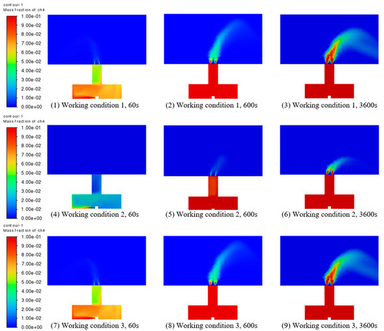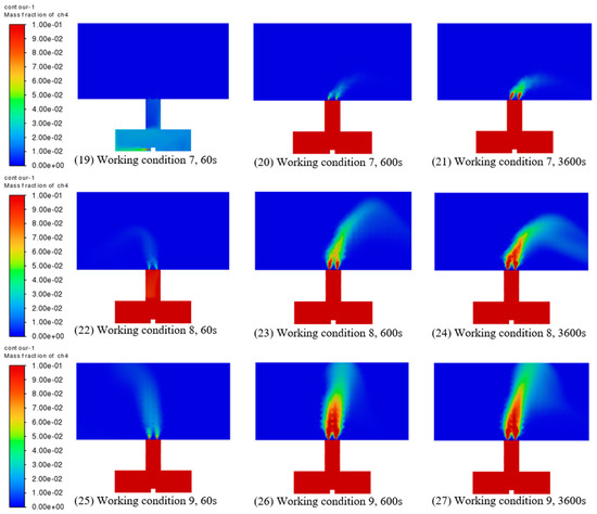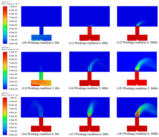 The concentration distribution of gas gate well leakage diffusion over time is depicted in Figure 7 under different working conditions. Initially, when the gas starts to leak from the well, it possesses a large amount of kinetic energy due to the high pressure in the pipeline. This causes the gas to be ejected horizontally, forming a distinct gas column. However, as the gas disperses, it encounters air resistance and friction, causing it to rapidly spread in all directions. The top of the pipe corridor acts as an obstruction, leading to lateral diffusion on the right side of the leakage hole. Some of the gas, under the influence of buoyancy, rises to the top of the shaft, while the remaining portion continues to migrate to the right side of the pipe corridor due to its initial kinetic energy. As time progresses, the kinetic energy of the migrating gas gradually diminishes. When the gas mixture, containing various gas components, reaches the top of the gate well, it creates a vortex that disrupts the stability of the gas column. As a result, the gas column outside the gate well gets displaced.