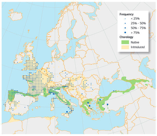 Frequency and chorology map of the distribution of Castanea sativa in Europe [6].