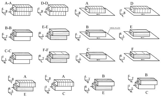 Therefore, Figure 2 presents the array of friction pairs that reflect combinations frequently encountered in structural connections. On the one hand, timber-to-timber tests could be divided among surfaces with identical orientations: A-A, B-B, C-C, D-D, E-E, and F-F, and tests between surfaces of differing orientations: A-C, A-E, B-C, and B-E. On the other hand, timber-to-steel tests were designed as A-S, B-S, C-S, D-S, E-S, and F-S, with S indicating the steel plate. Thus, the experimental program reached a total of over 400 tests and ultimately offered significant insights into frictional behavior.