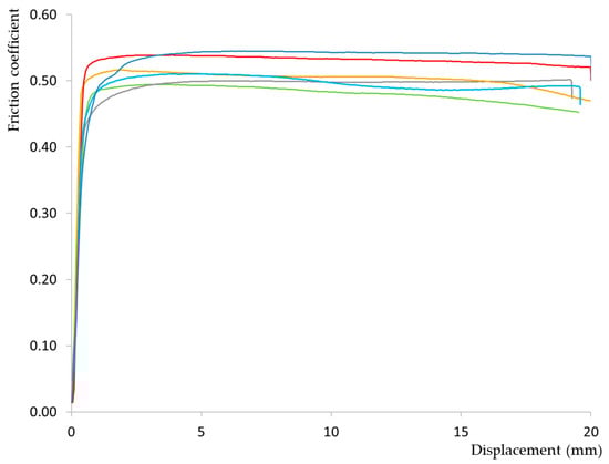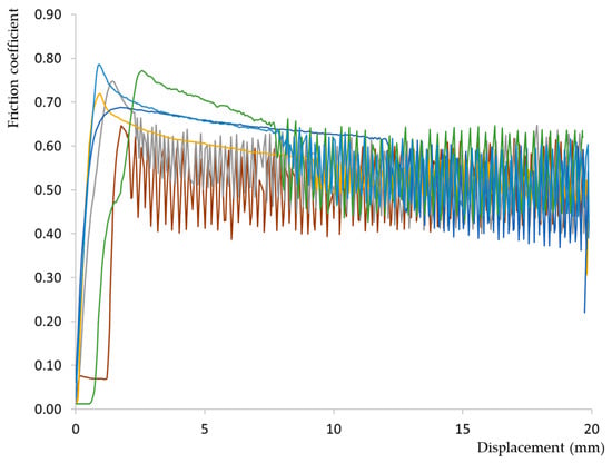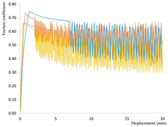 Figure 3 showcases the most illustrative graphs depicting the variation of the friction coefficient relative to the displacement for tests involving surfaces of identical orientations and friction directions under a controlled moisture content of 18%.