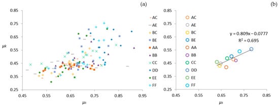 Relationship between the values of μk and μs for the different timber-to-timber friction pairs (a), as well as the mean value for each group, denoted by a circle in the corresponding color (b).