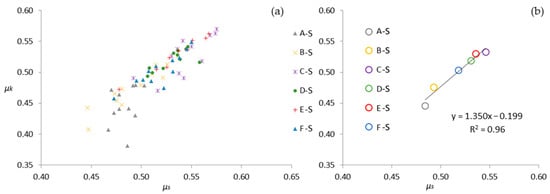 Although no strong relationship emerged from the entire dataset, the analysis of the average values (Figure 6b) allowed for an acceptable correlation (R2 = 0.70) between static and kinetic friction coefficients (Equation (2)).