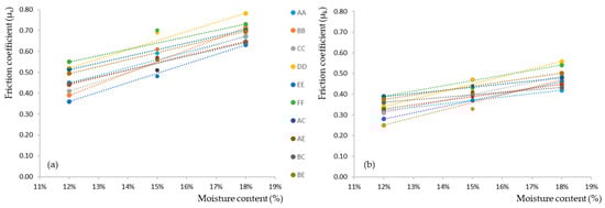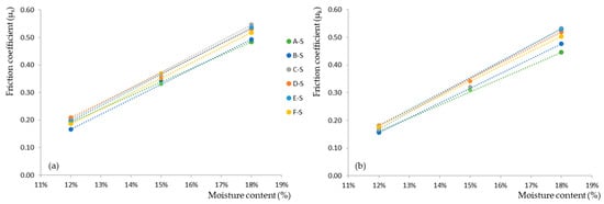 For each group of timber-to-steel tests, average static (a) and kinetic (b) friction coefficient values at moisture contents of 12% (from [31]), 15%, and 18%, as well as the linear regression between the two extreme values of the studied range, are shown.