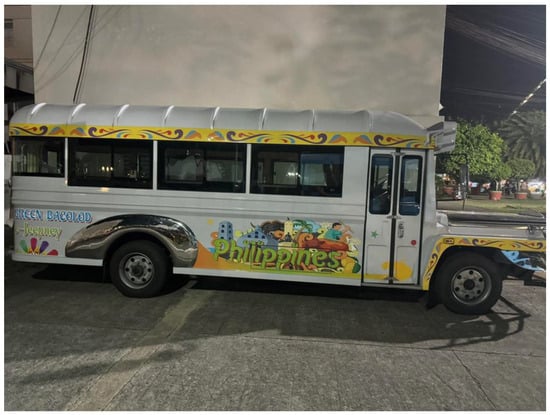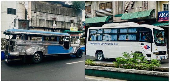 Public transportation is one of the most widely used commuter services by people within a community when going somewhere. It can accommodate more passengers than private cars, and, due to its evidently wide availability, it has contributed to an increase in carbon footprints. However, in the U.S., only 1.7% of population use public transportation, increasing by just 0.3% from 2001 to 2009. This proved that only a few people use public transportation compared to other transportation modes []. Consequently, Ong et al. [] indicated that public transportation such as jeepneys are more frequently utilized among developing countries due to economic concerns. It was added that common modes of transport for people in the Philippines are jeepneys, buses, light rail transits, and ride-hailing applications. The 2020 UNSDG Reports highlighted that despite the increased worldwide attention on sustainable transportation, findings from 2019 data across 610 cities in 95 countries revealed that merely half of the world’s urban population has good and convenient access to public transportation [].