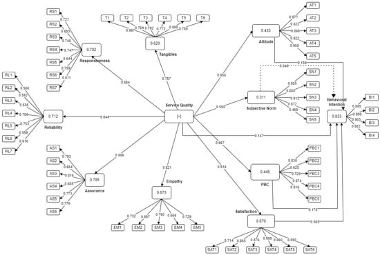 Presented in Figure 4 is the final SEM result of the model. It was revealed that service quality has a significant impact on assurance (β = 0.869, p = 0.00), empathy (β = 0.600, p = 0.00), responsiveness (β = 0.593, p = 0.00), tangibles (β = 0.0.449, p = 0.00), and reliability (β = 0.443, p = 0.00). It could also be seen that service quality has a significant influence on satisfaction (β = 0.559, p = 0.00), PBC (β = 0.426, p = 0.00), attitude (β = 0.407, p = 0.00), and subjective norm (β = 0.330, p = 0.00). Lastly, it was revealed that behavioral intention was significantly influenced by satisfaction (β = 0.673, p = 0.00), attitude (β = 0.169, p = 0.00), PBC (β = 0.083, p = 0.14), and service quality (β = 0.060, p = 0.00).