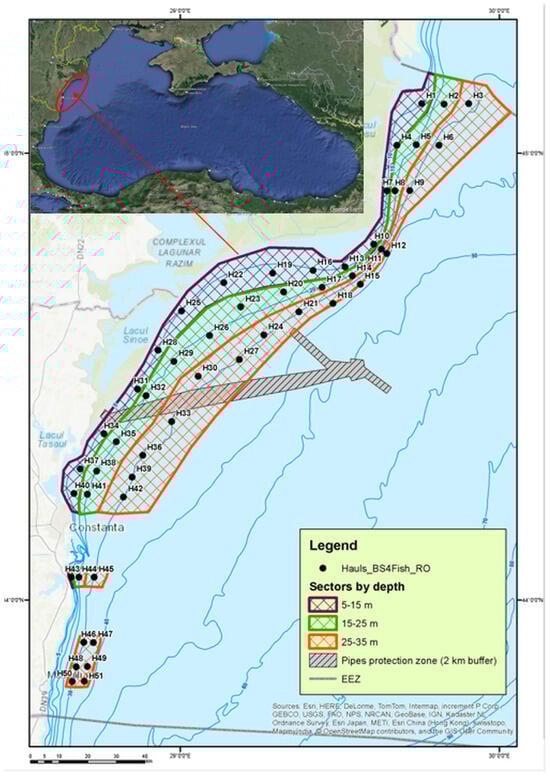 A total number of 51 stations were sampled yearly in the Romanian area in order to provide wide and homogeneous coverage of the continental shelf (Figure 1). The surveys were carried out on 3 water depth strata—5–15 m, 15–25 m and 25–35 m, respectively—covering a total research area of more than 5500 km2 (Table 1). The swept area covered by each haul ranged between 0.006 and 0.017 km2.
