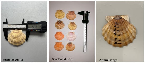 For a comprehensive analysis of population characteristics, a subsample of 122 individuals was preserved in 70% ethanol and transported to the laboratory. Additional measurements were performed using a carbon fiber composite digital caliper (model X0027BRMP7, RoHS, accuracy ±0.1 mm), for more reliability. Within the laboratory, morphological parameters, specifically shell height (H) and length (L), were assessed, for the larger left (upper) shell of each specimen (Figure 2 left). The measurements were systematically organized into size classes, divided at 2 mm intervals (Figure 2 center). Afterward, the scallops were scrubbed with a brush to clean any epibiotic deposit, and the rings on the upper shell were marked with a pencil (Figure 2 right). The biological age of the individuals was estimated based on the number of annual rings [15].