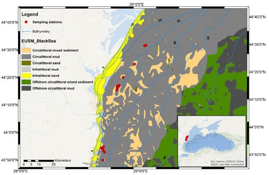 Sampling stations where live F. glaber individuals were identified during 2020–2023, referenced to habitat type on the Romanian continental shelf.