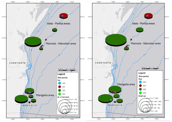 The abundance and biomass of F. glaber oscillated in the period 2020–2023 between 5 and 319 specimens (Figure 4 left) and 51.5 and 7377 g (Figure 4 right), respectively, with a peak in 2022 for both parameters considered. Concerning the spatial distribution, most specimens (>100) were recorded in the central part of the coast (off the Mamaia–Năvodari area), with significant occurrences (60–100 individuals) in the southern sector (off Mangalia), as well. The fewest F. glaber specimens were documented closer to the Danube mouths, off the Vadu–Portița area.
