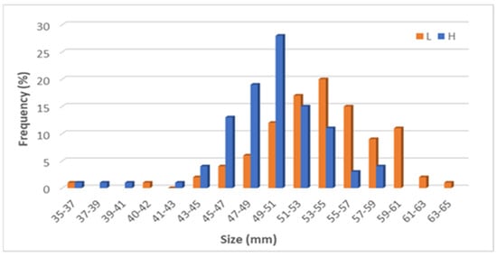 The shell length (L) of the analyzed specimens ranged between 36.8 and 63.6 mm, with an average length of 52.80 mm (±4.41 SD). The shell height (H) ranged from 35.8 to 58.1 mm, with a mean value of 48.78 mm (±3.76 SD). The size distribution was dominated by specimens within the length class of 53–55 mm (20%) and the height class of 49–51 mm (28%) (Figure 5). On average, shells were longer than higher with 4.01 mm (±1.70 SD). Just one individual was higher than longer (+0.6 mm).