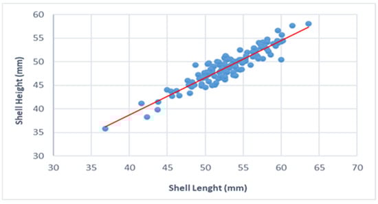 The relationship between shell length (L) and shell height (H) was established based on the allometric equation: