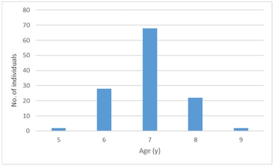 Analyses of the 122 F. glaber individuals brought to the laboratory revealed ages ranging from 5 to 9 years old. A significant share of the sampled population (56%; N = 68) fell within the 7-year age class, followed by the 6-year class (23%; N = 28) and 8-year age class (18%; N = 22). The size classes representing 5 and 9 years old exhibited the lowest representation (3%; N = 4) of the total number (Figure 7).