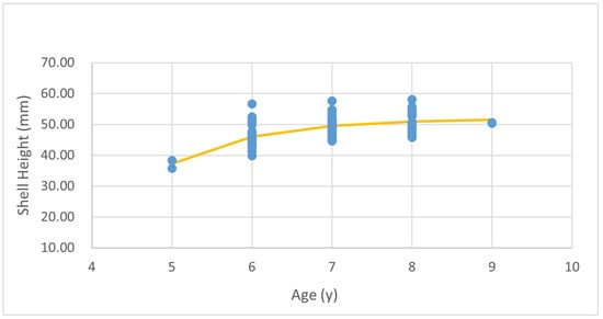 In this study, individuals aged 5 years exhibited dimensions ranging from 35.8 to 38.3 mm, while those aged 6 years had dimensions spanning between 39.8 to 56.6 mm. At 7 years of age, the individuals reached sizes of 44.6 to 57.6 mm, which increased slightly at 8 years to 45.8 to 58.1 mm. Finally, individuals aged 9 years showed dimensions ranging from 50.4 to 50.6 mm (Figure 8).