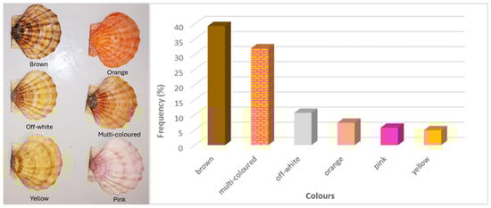 The investigated shells displayed six color morphs (Figure 9, left). The most frequent were brown (39%), multi-colored (32%) and off-white (11%) shells (Figure 9, right).