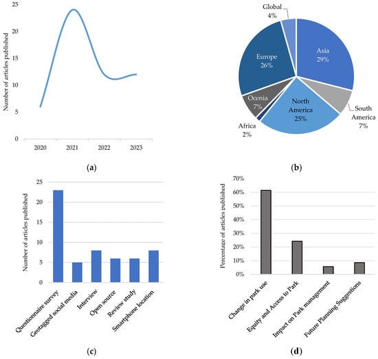 Most of the articles that have been published utilised questionnaires as their primary method of data collection, as shown in Figure 3c. However, due to the pandemic, authors shifted their focus towards online web-based surveys. Nevertheless, some comparative studies have evaluated the situation before and after COVID-19 using both in-person and online questionnaires. For research articles concentrating on user mobility in urban parks and green spaces, web-based mobility data such as Google mobility reports, social media data, or STRAVA are commonly used. Some studies have also gathered geo-tagged spatial data from mobile phone companies.