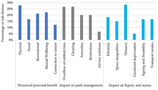 The reviewed articles comprehensively explored various aspects or sub-themes of urban parks affected by COVID-19. Figure 4 illustrates the percentile distribution of sub-themes covered by the selected studies under each broader theme identified in the review. It is observed that COVID-19 has heightened concerns regarding physical and recreational aspects in urban parks, especially during periods of isolation and lockdown measures. The distance from parks emerged as a significant factor, exacerbating inequalities among disadvantaged groups with limited mobility. Notably, the sudden surge of visitors presented challenges for park management, particularly in terms of cleaning and rubbish disposal, highlighting additional concerns for future management strategies.