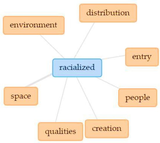 By employing an open-access text analysis tool called Voyant, we conducted an in-depth analysis of the reviewed articles, specifically focusing on exploring and understanding the disparities in urban park usage during the COVID-19 pandemic (Figure 5). The analysis prominently highlights the word “racialised,” which is strongly associated with “space.” Additionally, it underscores the perception that spaces are racialised not only in terms of their inherent qualities but also in their creation, distribution, and other dimensions.