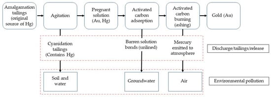 Moreover, conventional cyanide methods are not strictly followed in the study area (Figure 2). Due to the high cost of electrowinning cells, miners resort to activated carbon burning to recover gold without further processes [14]. Activated carbon also absorbs mercury [15,16,17]. Consequently, mercury evaporates into the atmosphere, contaminating nearby areas and posing risks to a larger population and a wider geographical area [18].
