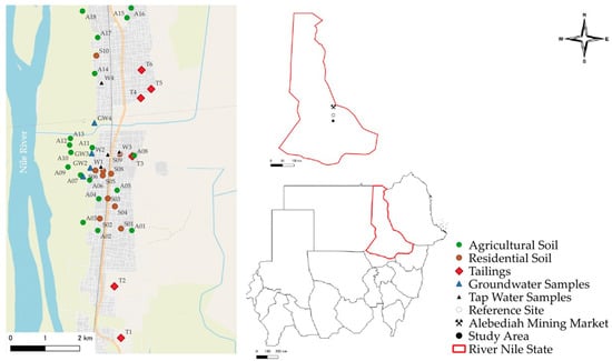 The study area encompasses Darmali town and its neighboring areas north of Atbara City, situated in River Nile State, Sudan (Figure 3). The ASGM operations in the area, particularly known as Darmali Mills, have gained nationwide recognition, although they extend beyond Darmali; the area is characterized by a semi-desert climate, with long summers and low rainfall intensity, averaging 84 mm/year, along with cold, dry winters [32]. The main drainage system comprises the River Nile, Atbara River, and seasonal wadis [32].