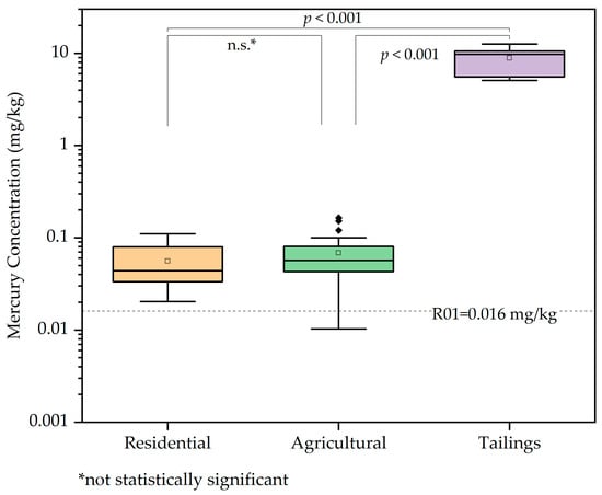 The mercury concentration varied among the samples from different land uses, with residential areas exhibiting the least median mercury concentration (0.044 mg/kg), followed by agricultural areas (0.057 mg/kg), and tailings (9.6 mg/kg), as depicted in Figure 4.