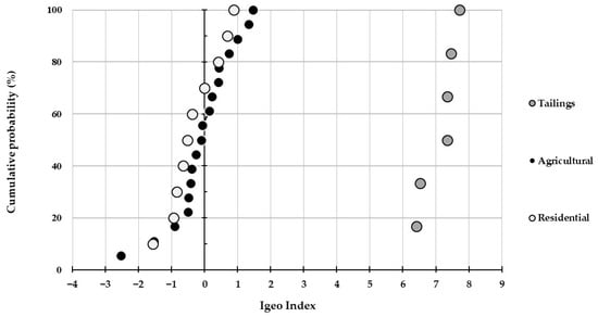 The median concentrations between the agricultural areas group and the residential group were not statistically different (p = 0.43). However, statistically significant differences were observed between the tailings group and both the agricultural areas (p = 0.005) and residential groups (p = 0.002). This implies that residential areas and farmlands are not influenced by the tailing dumps as a pollution source. It appears that there is almost no effect of mercury pollution in both groups, which is further confirmed by the results of the geo-accumulation index analysis (Igeo) (Section 3.2). Consequently, there seems to be no significant spatial variation in mercury contamination among these groups.