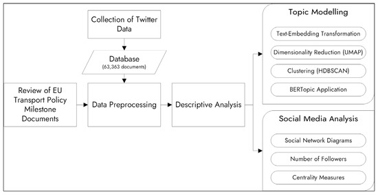 This section presents the crucial elements of the methodology implemented in the present research. Figure 1 illustrates the basic steps of the methodology, from reviewing EU transport policy milestone documents and collecting social media data, to extracting predominant topics in datasets and analyzing the spread of influence on social networks regarding EU climate and energy policy priorities for transport and mobility.