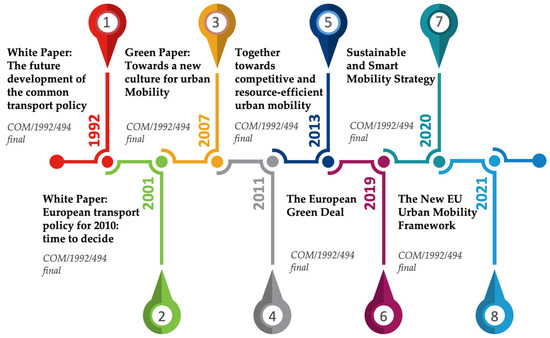 With the purpose of setting the background for the understanding and analysis of the concepts and findings from the current research, a comprehensive review of EU transport policy milestone documents was conducted, aiming to point out the main policy recommendations. As milestone documents are considered the high-level strategic frameworks periodically communicated by the European Commission in the last three decades, formulating the official common transport policy, the review includes the overarching transport policy strategies with a focus on the strategies for sustainable (urban) mobility. The urban level was selected to be part of the review due to the significant role of cities in decarbonization. It should be noted here that approximately 70% of GHG emissions globally are produced in cities [65].
