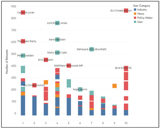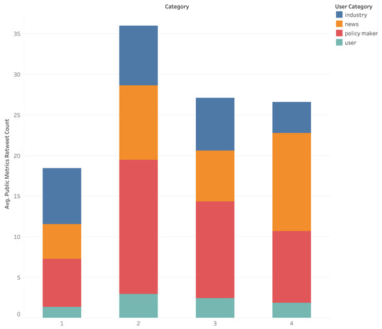 Based on the analysis, the average number of retweets per post is the highest in Category 2, while the lowest average number of retweets per post is found in Categories 1 and 4. This implies that even though Category 1, covering transport and sustainable development, has a larger number of posts, they do not have the same impact as the posts belonging to Category 2, referring to transport and climate change. Tweets on topics related to climate change in general are more popular compared to tweets related to the specific policy priorities that can be implemented to tackle climate change, such as autonomous and electric vehicles. The number of retweets indicates that the volume of messages published in a particular category does not guarantee a wider audience if the messages are not attractive enough to captivate the audience’s attention, and thus be retweeted and reach even more people in the Twitter social network.