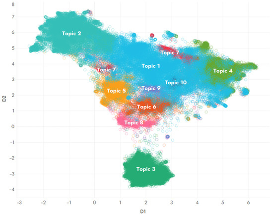 The first step in the process of applying BERTopic in a given corpus of text data refers to the transformation of text into embeddings, i.e., numerical representations. In order to generate embeddings that reflect the meaning of each as accurately as possible, a preprocessing step of the documents needs to be performed beforehand. More specifically, during this stage, the segmentation of each document into smaller “tokens” is performed to assist the embedding model in detecting terms in each document. In our case, we exploited the “CountVectorizer” function to perform the preprocessing of our documents. Although other topic models require further preprocessing steps, such as the removal of stop words or lemmatization, these are not prerequisites for the BERTopic model, since stop words and derivatives of words assist the model in determining the actual context of each sentence. In our analysis, we exploited pre-trained transformer models for creating dense vectors of each document, and, more specifically, the “all-MiniLM-L6-v2” embedding model. This choice was made due to the model’s low computational requirements and due to the accurate depiction of the semantic meaning of each document, as was proven in the topic clustering later in the methodology. However, due to the utilization of high dimensional vectors from the transformer models utilized for the representation of the meaning of each document (384 dimensions in our case), a visual inspection of the results of the topic analysis is not possible. To counter this issue, dimensionality reduction algorithms were applied to the embeddings in order to project their information in two (2) or three (3) dimensions without losing any contextual details. The modular character of BERTopic allows for the application of several dimensionality reduction algorithms, such as t-distributed stochastic neighbor embedding (t-SNE) and uniform manifold approximation and projection (UMAP). For our analysis, we choose to use the UMAP model, which according to the literature has the ability to distinguish groups of data more clearly [79], while being significantly faster in computation time compared to t-SNE [80]. By following a trial-and-error approach and by inspecting the output of the model, we selected the optimal value for the number of neighbors (equal to 100), thus ensuring that the model can represent the global context of the corpus as well as keep local characteristics.