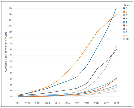 Figure 3 shows the total number of tweets collected per year and the percentage of tweets belonging to each data content category. The thickness of each line in the chart represents the quantity of data collected each year, while the different colors represent the categories based on which the data was collected.