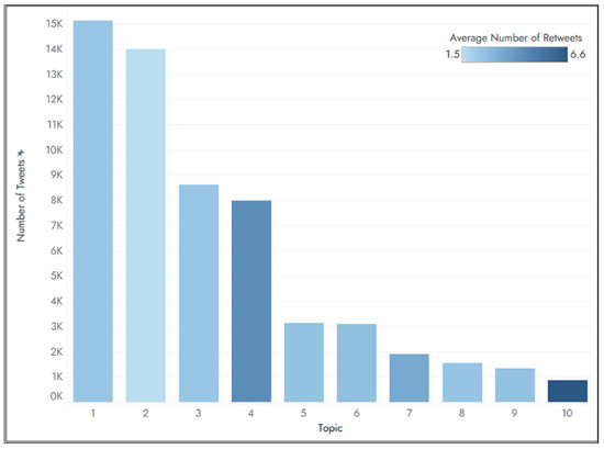 Our topic model ultimately identified 10 unique topics in our database. Table 2 provides an overview of the topics with details on the number of tweets per topic, as well as a title that reflects the thematic field discussed by the tweets in each topic. The topic title is a descriptive narrative that connects the identified terms with specific policy priorities identified in the analyzed EU policy documents, as mentioned in Section 3.2, and other EU or national initiatives. For example, the terms identified in Topic 1 were linked to the New EU Urban Mobility Framework’s priority: “Towards climate-neutral cities: resilient, environmentally friendly and energy-efficient urban transport” and the narrative: “Given the availability of suitable technological and other policy solutions for zero-emission mobility, cities should take measures to facilitate the green transition and ultimately ensure that urban mobility and transport becomes climate neutral as early as possible.” [76], as well as the European Climate Pact’s reference to “Green Mobility” [91]. Another example, which refers to a national initiative, is Topic 6 including terms directly related to UK’s strategy for decarbonizing the transport sector [92].