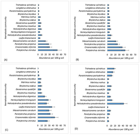 Total abundance of the nematode community at the species level per 100 g soil observed at different collection times (A) October 2020 (Pf1), (B) March 2021 (Pf2), (C) October 2021 (Pf3), (D) March 2022 (Pf4), (n = 3).