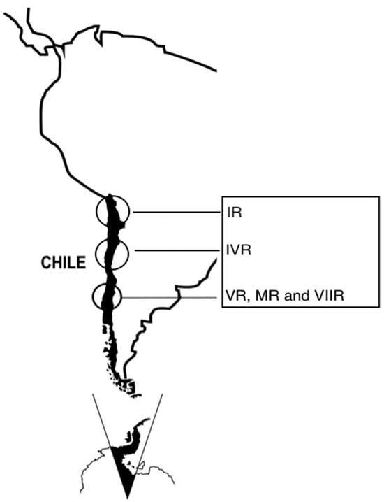 Geographical location of the markets considered in this study. Source: Own elaboration based on map sourced from the Military Geographic Institute of Chile. Available online: https://www.igm.cl (accessed on 11 March 2021).