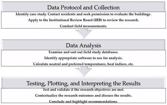 The current study utilizes field studies of thermal comfort (FSTC) [41], including environmental monitoring of variables and thermal comfort surveys to collect data for analysis. The thermal comfort surveys are paper based; the residents were asked to rate their current indoor environmental conditions at the time of completion of the surveys. The on-site monitoring involves physical measurements of variables within the thermal environment. The design of the investigation that outlines the data-collection protocol, analysis, interpretation, and recommendations is shown in Figure 1 below. The figure shows the first step in the framework for the research is data protocol and collection. The next step is data analysis, followed by testing, piloting, and interpreting the results.
