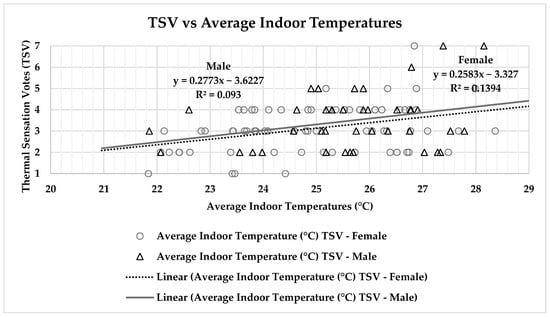 Figure 2 shows no relationship between the mean sensation (TSV) and average indoor temperatures for males. The regression reveals that a change in the indoor temperatures does not significantly lead to changes in thermal sensation votes, especially from the cooler to the warmer part of the sensation scale among different groups of residents. The result reveals a weak R2 value between the mean sensation and indoor temperatures for females and males. Figure 3 shows a weak R2 value between the mean thermal preference votes (TSV) and average indoor temperatures for females, while a relationship exists between the variables for males. The finding reveals a rise in indoor temperatures leads to changes in the thermal preference votes among males.