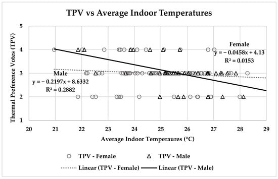 The research also examined the neutral and preferred temperatures using regression analyses. The neutral temperatures were calculated by plotting the average indoor temperatures in the case-study buildings versus the thermal sensation votes. For female respondents, the neutral temperatures varied from 24.1 °C to 26.1 °C. The neutral temperatures for male residents ranged from 24.4 °C to 26.7 °C. The results showed male residents feel “neutral” or “no change” to the indoor thermal environment at higher temperatures than female occupants. Likewise, the preferred temperatures were computed by plotting the average indoor temperatures versus thermal preference votes. The outcomes showed the preferred temperatures for female occupants varied from 23.9 °C to 25.4 °C. For the male occupants, the preferred temperatures ranged from 24.3 °C to 26.5 °C. The study also showed male residents prefer “no change” to the indoor thermal environment at higher temperatures than female residents.