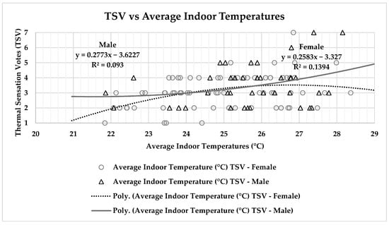 The study considered regression analyses to determine the mean neutral and preferred temperatures (Figure 2 and Figure 3). The R2 values were low, but the analyses are crucial to compute the variables The average preferred temperature of 24.9 °C was calculated for females, while the mean preferred temperature of 25.6 °C was computed for males. The research revealed male residents prefer “no change” to the thermal environment of the case-study buildings at significantly higher temperatures than female residents. The study also showed a difference of 0.1 °C between the mean neutral and preferred temperatures for males. A difference of 0.6 °C is noted between the average neutral and preferred temperatures for females. The study also considered polynomial analyses to further understand relationships between thermal sensation votes and average indoor temperatures. The R2 values were also low and similar to the values obtained when regression analyses were considered (Figure 4). The investigation also found similar outcomes between thermal preference votes and average indoor temperatures. Table 7 outlines the mean values for the neutral and preferred temperatures for female and male respondents in the buildings.