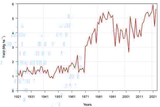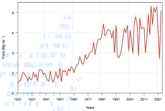 Winter wheat is produced in the largest area in Hungary, and this crop has covered 0.7–1.7 million hectares of land in the last hundred years. Figure 1 shows the national average winter wheat yields in Hungary for the period of 1921–2023.