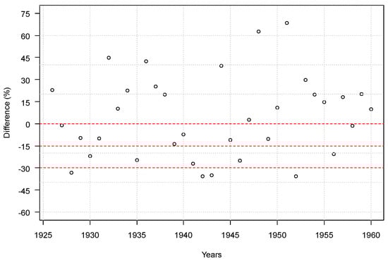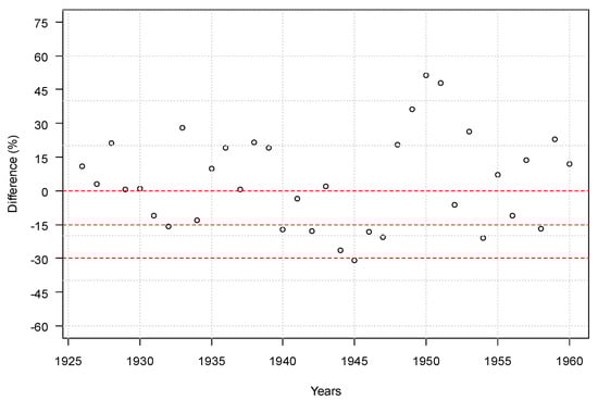 Yield fluctuations of winter wheat in Hungary in the period of 1926–1960. Red dashed lines indicate the values of no yield loss (0), at least a 15% yield loss (−15) and at least a 30% yield loss (−30).