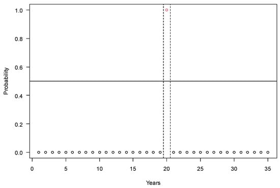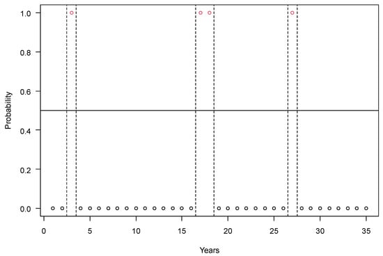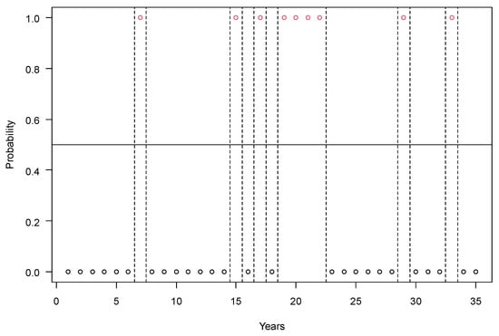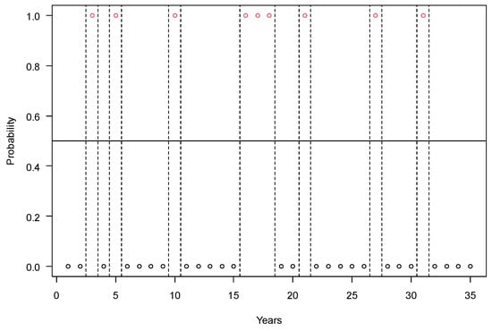 The number of years with yield losses of maize below and above 15% in Hungary in the period of 1926–1960. Years with yield failure are marked with a probability of 1 (red circles) and the normal years with a probability of 0 (black circles). Legends: runs = 15; n1 = 9, n2 = 26, n = 35; p-value = 0.7757.