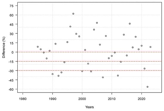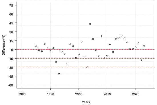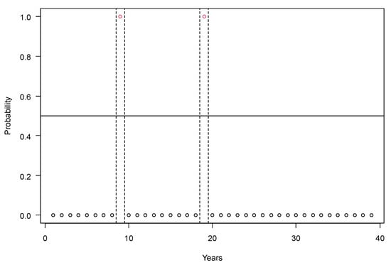 Similarly to the results of the Wald–Wolfowitz runs test determined for the first period, the series of losses of at least 15% in the second period can be considered random, and they do not include either trends or negative autocorrelation (Figure 6). During the investigated 39 years, a 15% yield loss occurred a total of five times. On average, we can expect yield losses of this magnitude once every 7.8 years, so roughly every 8 years. In this period, the frequency of yield failure was halved compared to the period of 1926–1960.