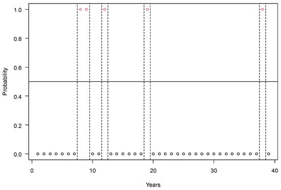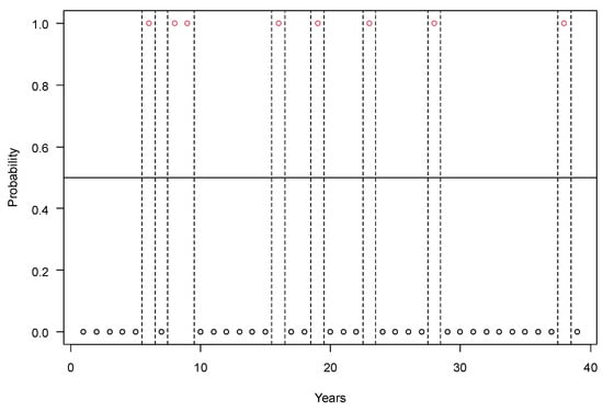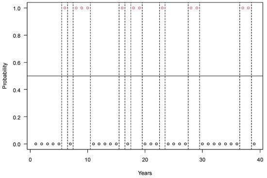 The number of years with yield losses of maize below and above 30% in Hungary in the period of 1985–2023. Years with yield failure are marked with a probability of 1 (red circles) and the normal years with a probability of 0 (black circles). Legends: runs = 15; n1 = 8, n2 = 31, n = 39; p-value = 0.5174.