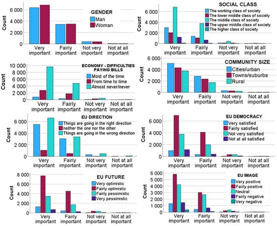 The association of the variables ‘EU democracy’ and ‘EU future’ with the importance of agriculture and rural communities for the future of the EU is similar. The two variables, ‘EU democracy’ and ‘EU future’, correlate positively.