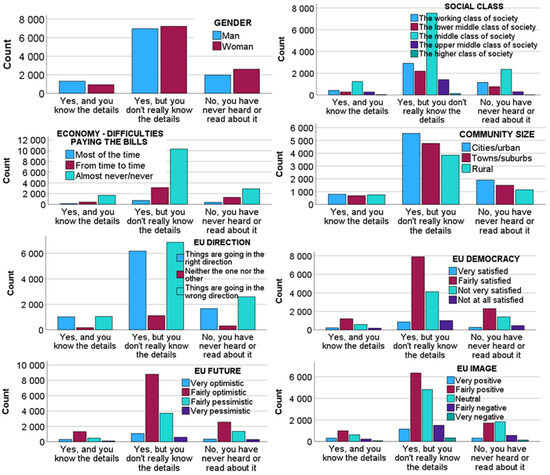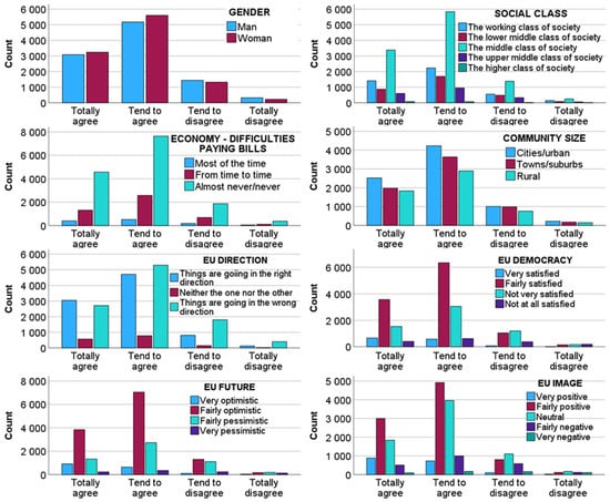 EU respondents feeling satisfied with the way EU democracy works acknowledge the importance of agriculture and rural communities for the future of the EU, show awareness of the CAP and its details and agree that CAP benefits all EU citizens and not only the farmers. The more satisfied EU Citizens tend to agree the economic support given by the EU to farmers is too high and therefore should not change or should decrease over the next ten years. Similar results are observed for EU Citizens more satisfied with the EU’s Future and confident about an EU positive image. The results agree with the findings of Dabrowski et al. [