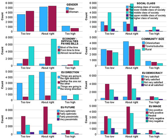 More ECs than expected, belonging to the working and lower-middle class, think the economic support given by the EU to farmers is ‘too low’, while the opposite is observed for the middle, upper-middle and higher classes of society. There is a linear association, with lower classes of society tending to think the support is ‘too low’ and higher classes thinking the support is ‘too high’.