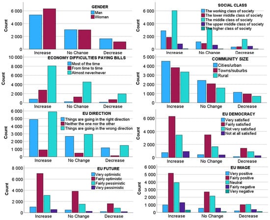 More ECs than expected, in the working and lower-middle class, think the economic support given by the EU to farmers should increase, while the opposite is observed for the middle, upper-middle and higher classes of society. There is a linear association, with the lower classes of society tending to support an increase in EU support for farmers.