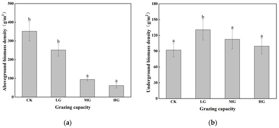 Changes in Stipa krylovii biomass density under different grazing intensities: (a) aboveground and (b) underground. Letters indicate differences among different grazing intensity groups for the same indicator (p < 0.05). Significant differences between variables are marked by different letters.